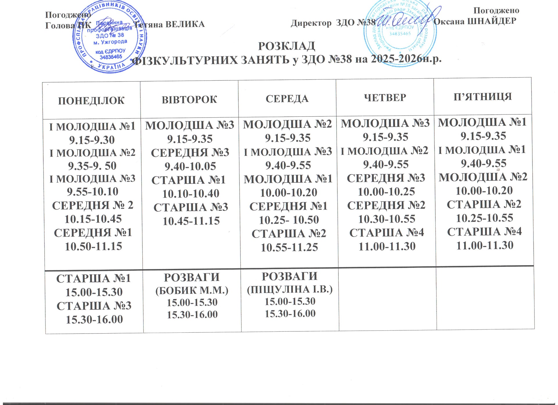РОЗКЛАД ФІЗКУЛЬТУРНИХ ЗАНЯТЬ У ЗДО №38
